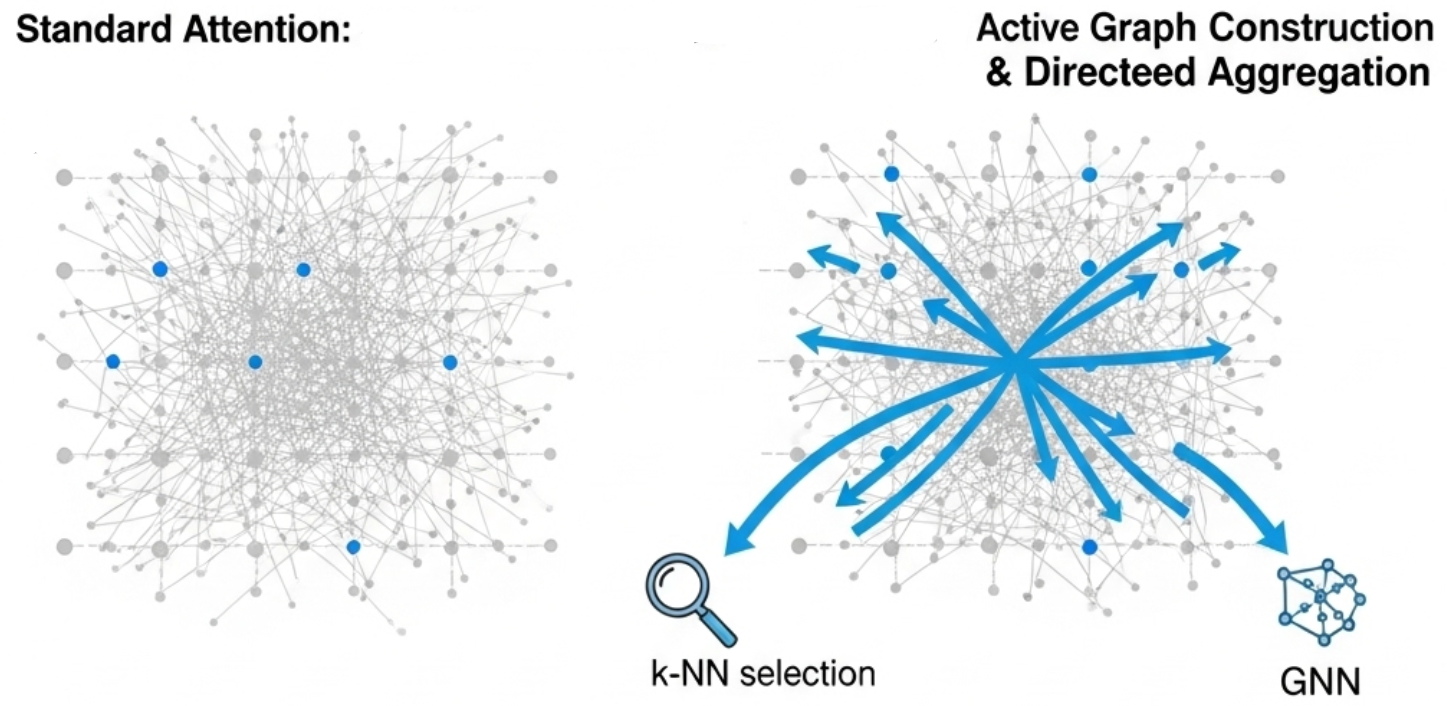 通过引入显式的由数据驱动的图结构,将注意力机制从一个密集的全局广播,转变为一个稀疏、高效的结构化通信方式。这种转变在处理含有大量冗余信息的视觉数据时,在理论上显示出了一些优势。
